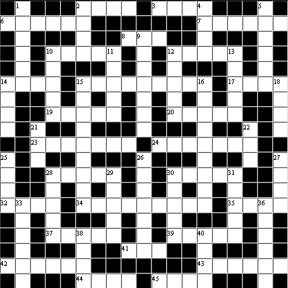 | По горизонтали: 2. Неровность дорожного покрытия. 3. Приток Москвы-реки. 6. Прибор для определения направления и скорости ветра. 7. Одно из названий полиамидного волокна. 8. Царство мертвых в греческой мифологии. 10. Служитель дохристианского культа в древней Руси. 12. Римская провинция в Древней Палестине. 14. Футбольный клуб из Голландии. 15. Граф, авантюрист итальянского происхождения. 17. Закуска из тертых кабачков и баклажанов. 19. Химический элемент, платиновый металл. 20. Стилизация под старину в музыке, фотографии и т. п. 23. Исполнитель главных ролей в фильмах Марка Захарова. 24. Город невест. 28. Бег. 30. Источник знаний. 32. Полупроводниковый прибор с односторонней проводимостью. 34. В прошлом - центр художественной жизни России, ныне Музей-усадьба в Подмосковье. 35. Персонаж романа "Братья Карамазовы". 37. Геометрическая фигура. 39. Большой секрет. 41. Источник сырья для плетеных корзин. 42. Конструкция из костей. 43. Древнее название Крыма. 44. Марка немецкого авто. 45. Столица Индии. По вертикали: 1. Футбольный клуб из Владикавказа. 2. Река в России. 4. Один из электродов. 5. Ведущая мировая валюта. 9. Новогодняя жертва иронии судьбы. 10. Инвентарь лодочника. 11. Съедобный гриб. 12. Один из сильнейших итальянских футбольных клубов. 13. Божество славяно-русской мифологии, связанное с плодородием. 14. Казахский поэт-просветитель. 15. Российская эстрадная певица, исполнительница баллад. 16. Местечко около московского телецентра. 18. Слово, означающее опасность у грабителей. 21. Большое помещение. 22. Форма брачного поведения млекопитающих. 25. Собирательный титул английского высшего дворянства. 26. Советский изобретатель, конструктор авиадвигателей. 27. Верхний слой почвы. 28. Адамово яблоко. 29. Американский магнат известный своей благотворительностью. 30. Один из основных атрибутов христианства. 31. Театральная доска объявлений. 33. Город в Красноярском крае, порт на р. Енисей. 36. Земляной орех. 38. Символ музыкальной грамоты. 40. Одно из названий Снежного человека.